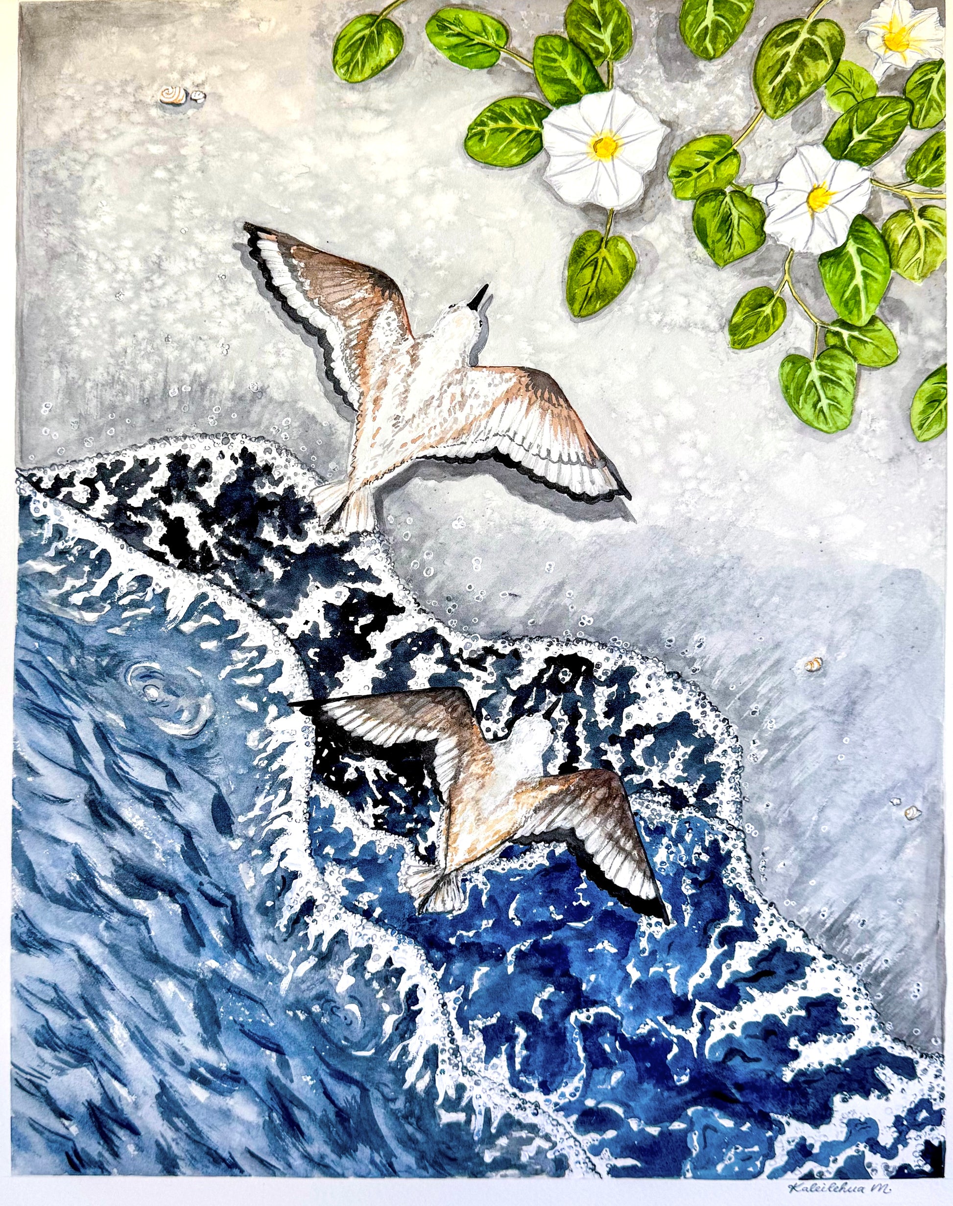 Original watercolor of Hunakai birds flying closely over black sand shores and Hunakai flowers.